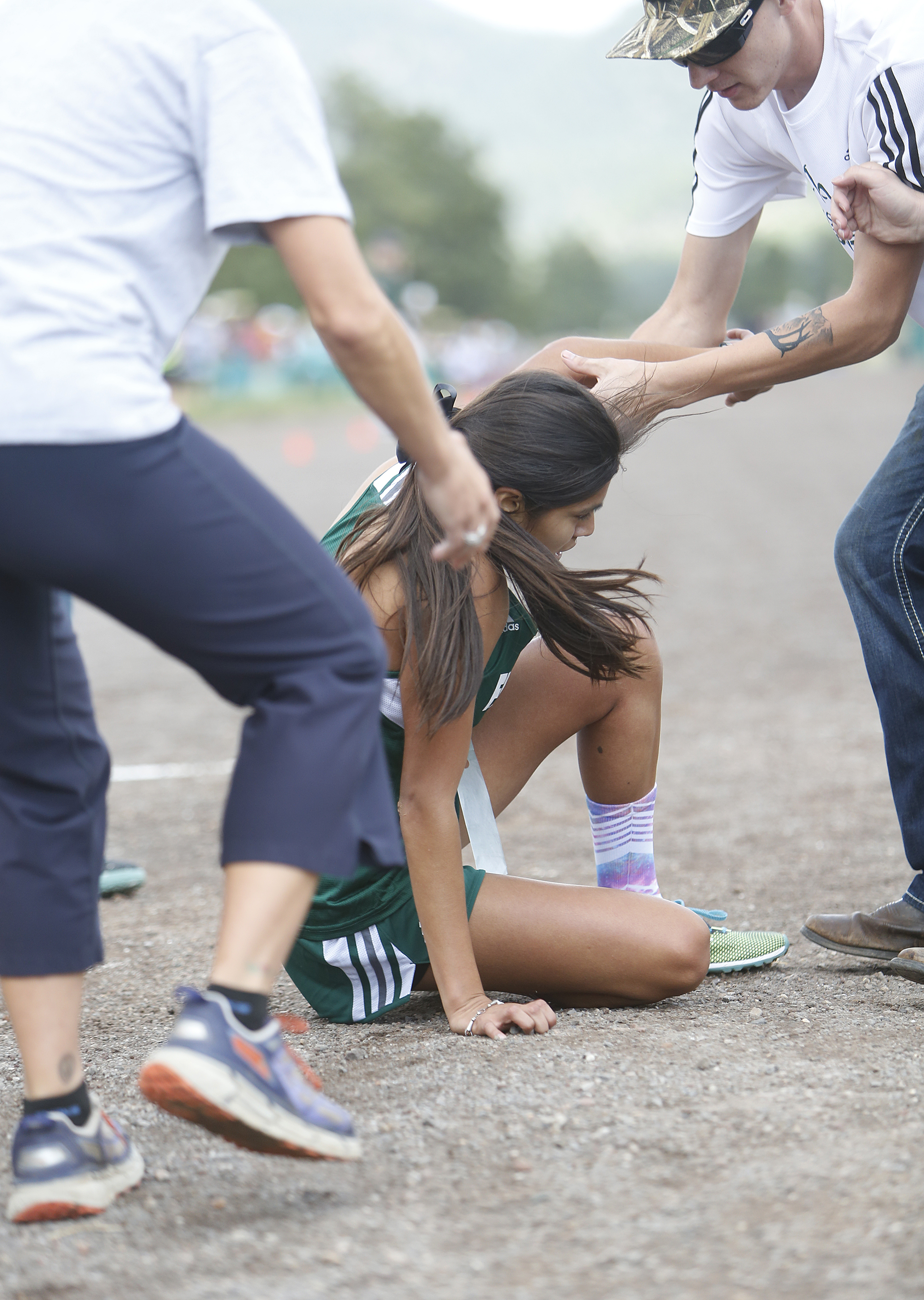 Flagstaff High School Senior Courtney Lewis is helped to her feet after collapsing in exhaustion upon crossing the finish line. Lewis placed second with a time of 19:22.6.