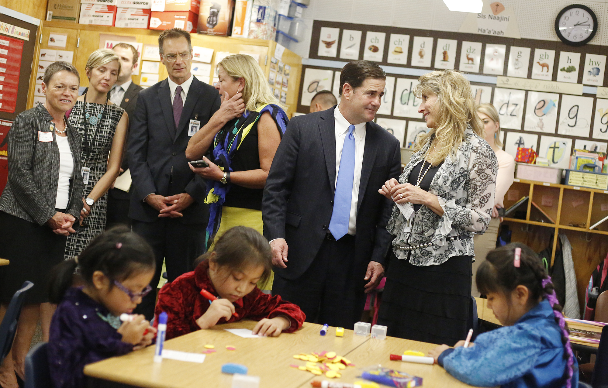 Arizona Governor Doug Ducey, center, visits a third-grade Navajo immersion class room at Puente de Hozho School with Principal Dawn Trubakoff, right, Wednesday afternoon.