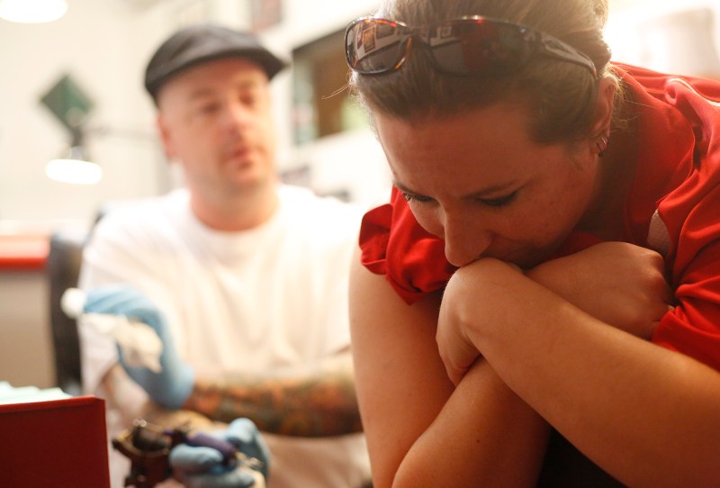 Lerin Cook leans over chair in Birch Avenue Tattoo as artist Pete Meiners prepares to give her a semicolon tattoo as part of Thursday’s World Suicide Prevention Day fundraiser at the Tattoo shop. All proceeds from the event went to help fund the Flagstaff Semicolon Project.