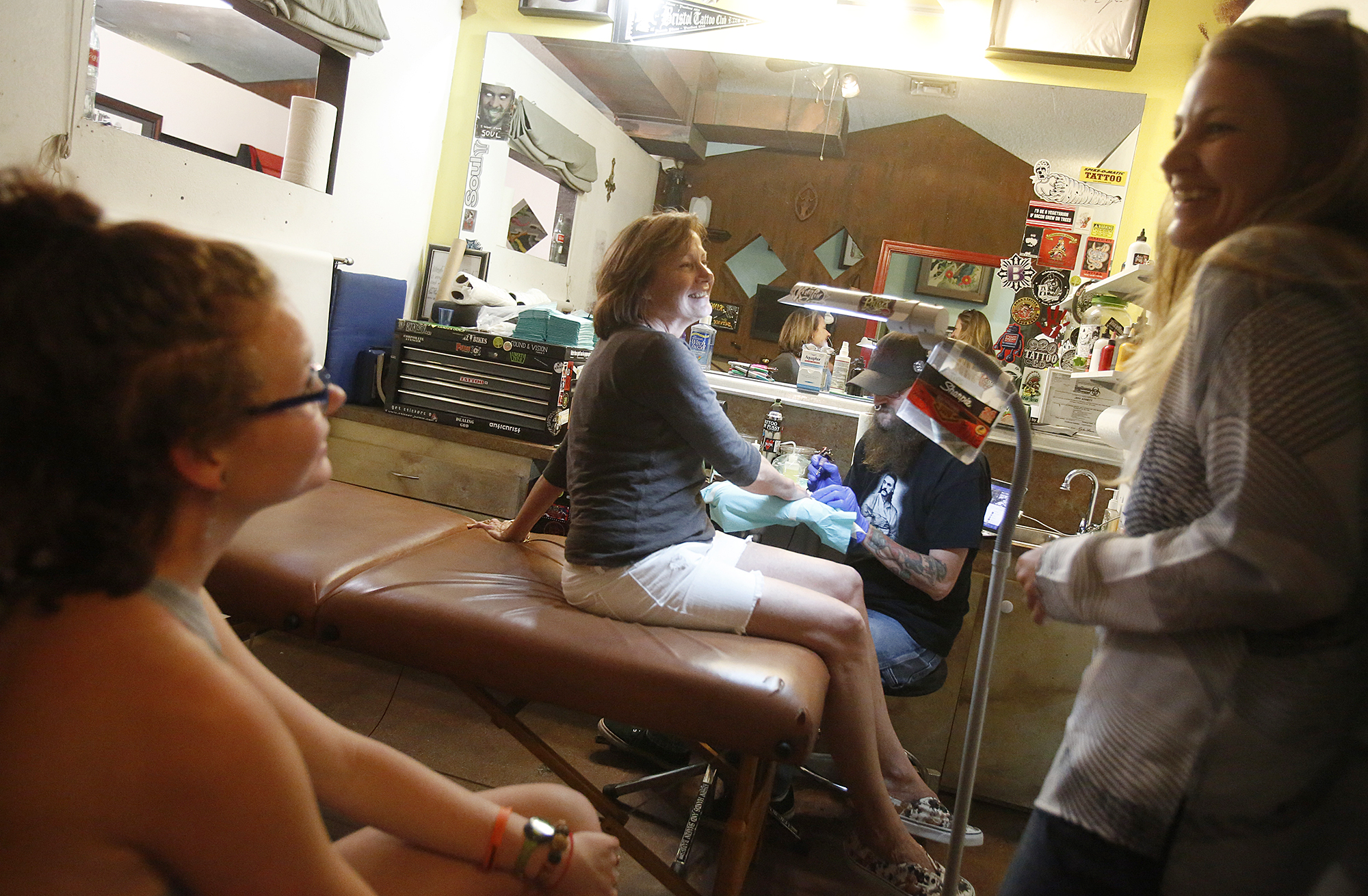Hefe from Birch Avenue Tattoo gives Carthy Metz, center, a semicolon tattoo on her hand while her daughter Rachel Metz, left and family friend Kelsey Pugh, right look on. In support of the Semicolon Project, Birch Avenue Tattoo hosted a charity fundraising event where for $20 customers could have a small semicolon tattooed on their body.