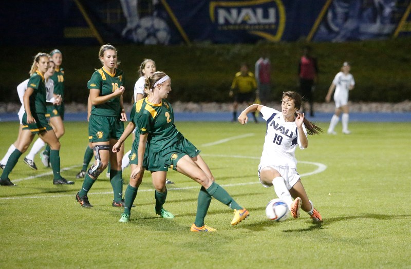 Adrian Nixt (19) of Northern Arizona University maneuvers around a North Dakota State player Friday.