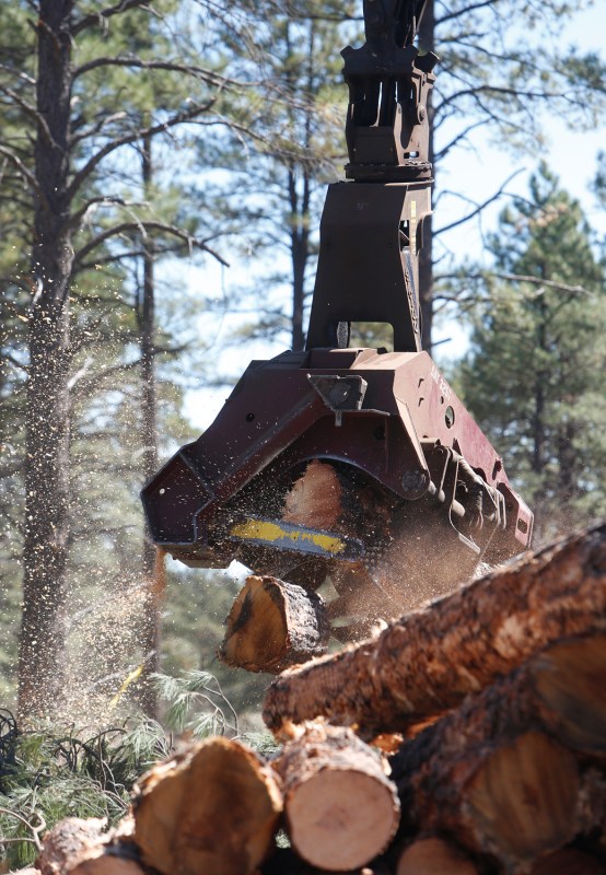 A close up of a dangle head processor cutting logs to length at a logging site outside of Williams, Ariz.
