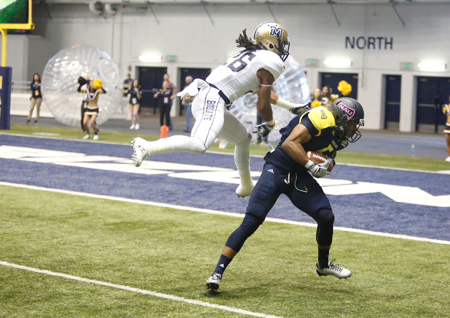 Northern Arizona University wide receiver Dejzon Walker (5) completes a pass on his way to a touchdown against Montana State Saturday.