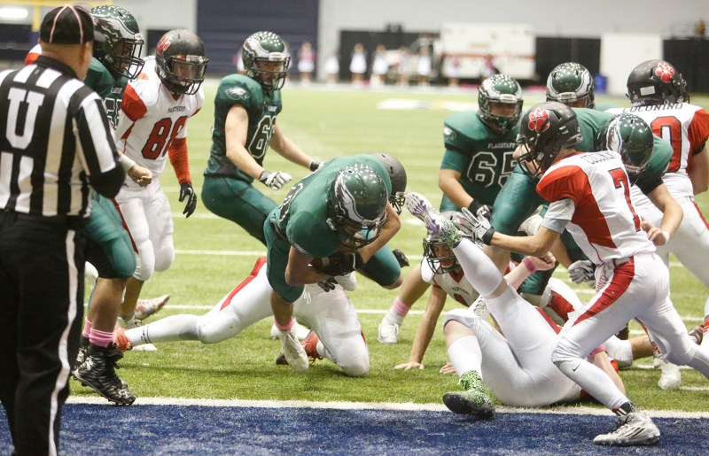 Flagstaff High School’s Austin Rhoda (40) dives through the Coconino defense for a touchdown during Friday night’s city title game at the Walkup Skydome.
