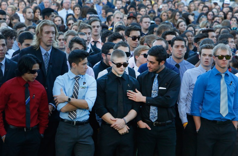 Nicholas Prato, center, one of the victims of last week’s shooting incident that took place at Northern Arizona University, stands with fellow fraternity members during a walk and gathering Tuesday afternoon to honor the victims of Friday’s deadly shooting on the NAU campus.
