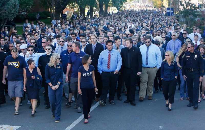 Several thousand people participated in a walk and gathering through the campus of Northern Arizona University in Flagstaff, Ariz. to honor the victims of Friday’s deadly shooting.