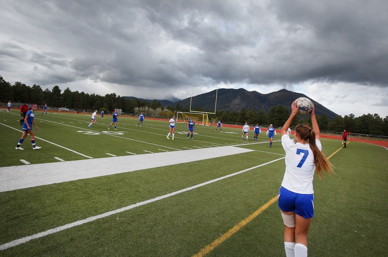 Northland Preparatory Academy’s Delaney Page (7) throws the ball back into play during Thursday afternoon’s game against Chino Valley.