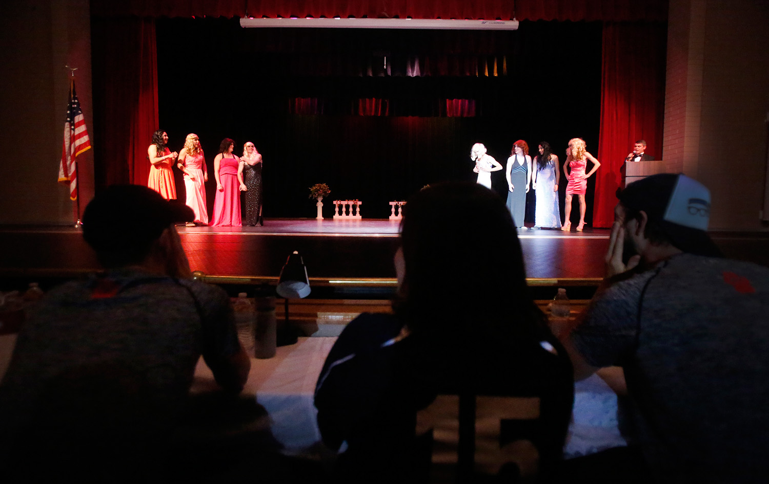 A panel of judges watches as participants in the Mr. Coconino Pageant are introduced to the audience at Coconino High School Thursday night. Junior and senior boys dressed as women to compete in the pageant, which some people said was offensive to transgender people.