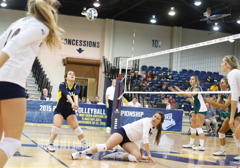 Northern Arizona University’s Stacia Williams (2) digs the ball during game action Friday.