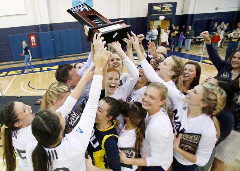 The Northern Arizona University volleyball team celebrates after beating Idaho State to win the Big Sky Conference Championship tournament Saturday night.