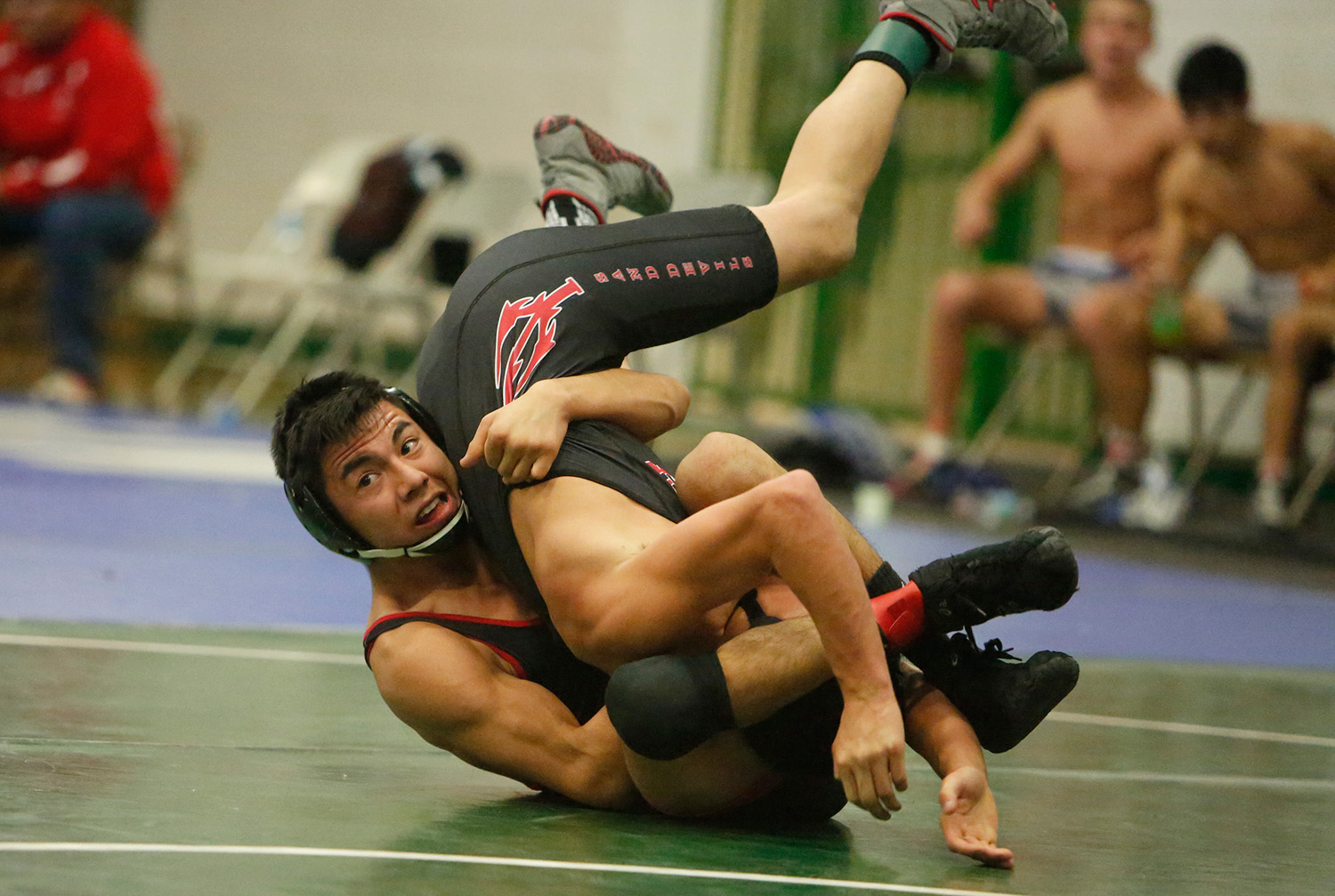 Isaac Cabrera of Coconino High School wrestles against an opponent from Page in the 120-pound weight class of the Peak wrestling tournament Saturday.