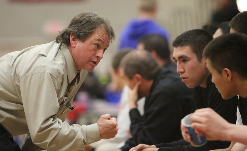 Coconino Head Coach Kelley Smith talks to players on the bench during Tuesday evening’s game against Kingman. (Taylor Mahoney/Arizona Daily Sun)