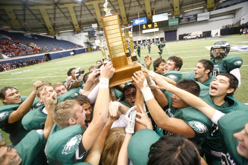 The Flagstaff High School Eagles football team celebrates after winning the city title game against Coconino High Friday night.