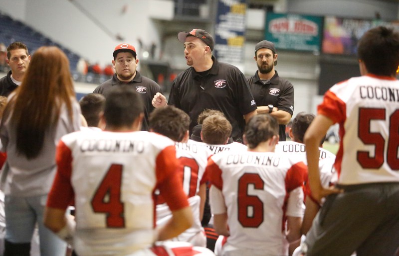 Coconino High School Head Coach Jeremiah Smith talks with his team after Friday night’s city title game against Flagstaff High.