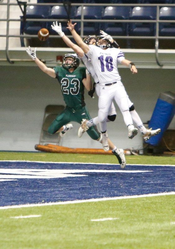 Flagstaff High School’s Bridger Hershey (23) jumps to catch the ball along with two Payson players during game action Friday.