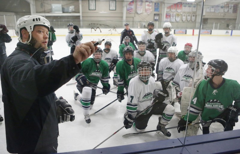Flagstaff Avalanche Head Coach Denny Lauritsen draws play diagrams on the glass during practice at Jay Lively Activity Center Thursday. (Taylor Mahoney/Arizona Daily Sun)
