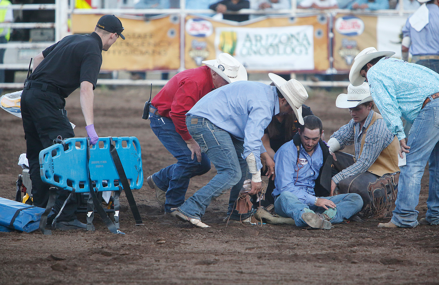 Tolman Moore of Las Cruces, N.M. is helped to his feet after being knocked unconcious when he was tossed from his horse during the bareback bronc riding competition at the Flagstaff Pro Rodeo Thursday evening.