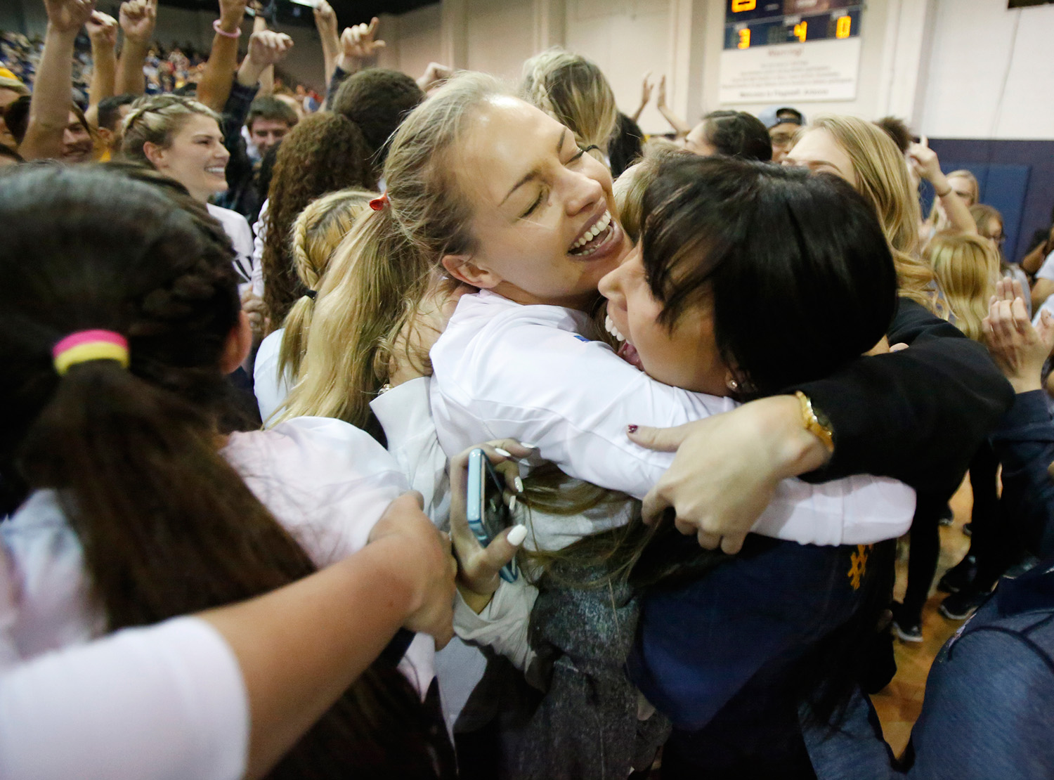Addy Lofstedt celebrates with her team after beating Idaho State for the Big Sky Conference Championship Saturday night.