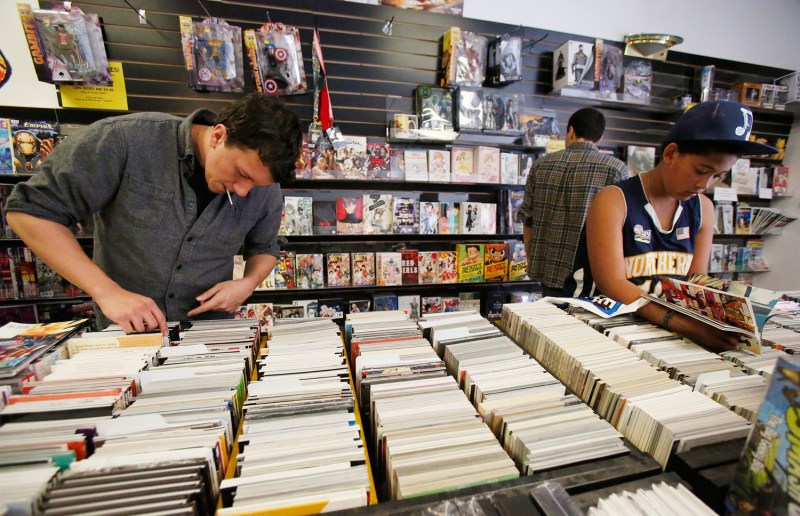 Kaleb Lightfood, left, and Rowan Mitchell St-John, right, dig through the stacks of comic books at Cab Comics during Free Comic Book Day celebrations Saturday.