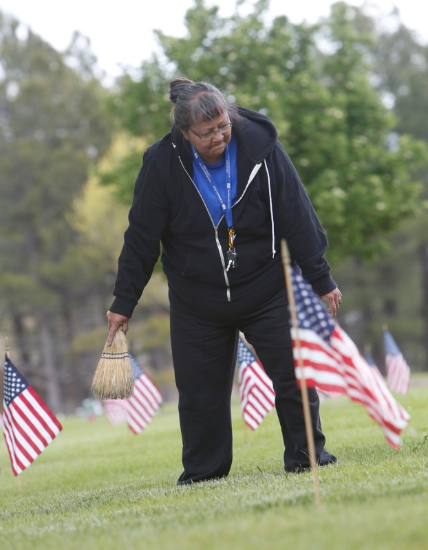 Beverly Thomas of Flagstaff uses a small broom to sweep off the head stones of military services members in preparation for Memorial Day ceremonies to be held at Citizens Cemetery in Flagstaff Monday.