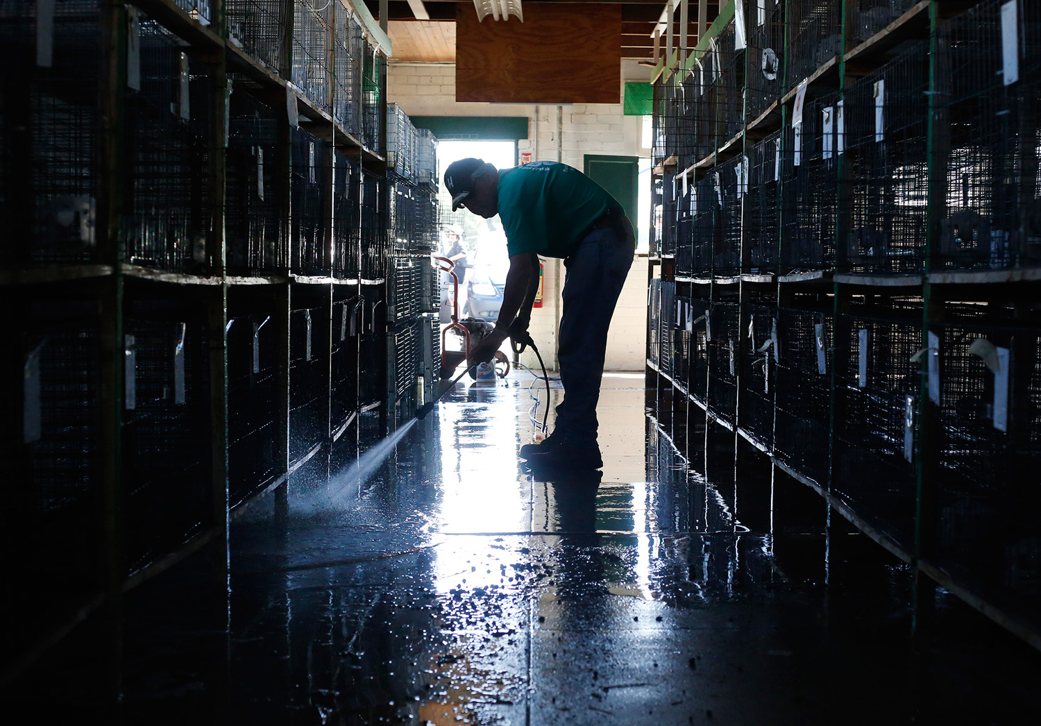 Mark Richardson uses a pressure washer to clean the floor of the 4-H Club rabbit barn ahead of the Coconino County Fair.