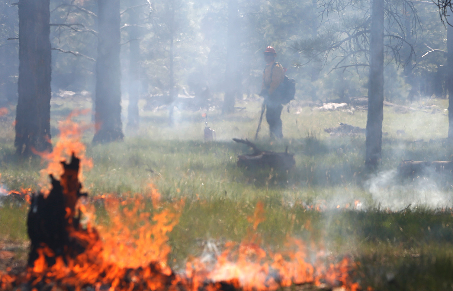A firefighter with the Coconino National Forest stands in clouds of smoke monitoring burning grass at a managed fire near Mormon Lake Wednesday afternoon.