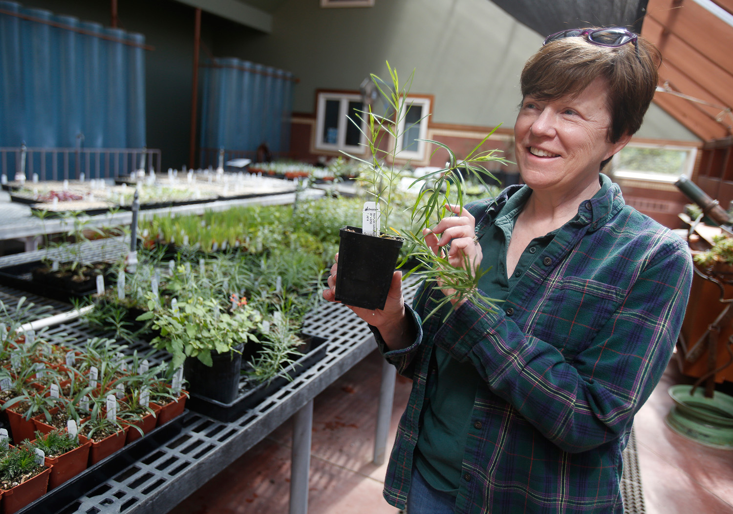 Lynn Nemeth, Executive DIrector of the Arboretum at Flagstaff, stands in a green house with a Horsetail Milkweed plant, one of several varieties being planted in hopes of helping to restore declining Monarch butterfly populations. Monarchs lay their eggs on Milkweed and it is the only plant that their larvae eat making it extremely critical for the species.