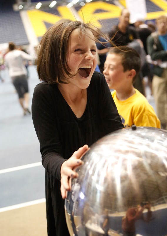 Zoe Rucker, 10, touches a static charged ball which causes her hair to stand on end during the second-annual Flagstaff Community STEM Celebration at the Skydome Wednesday evening.