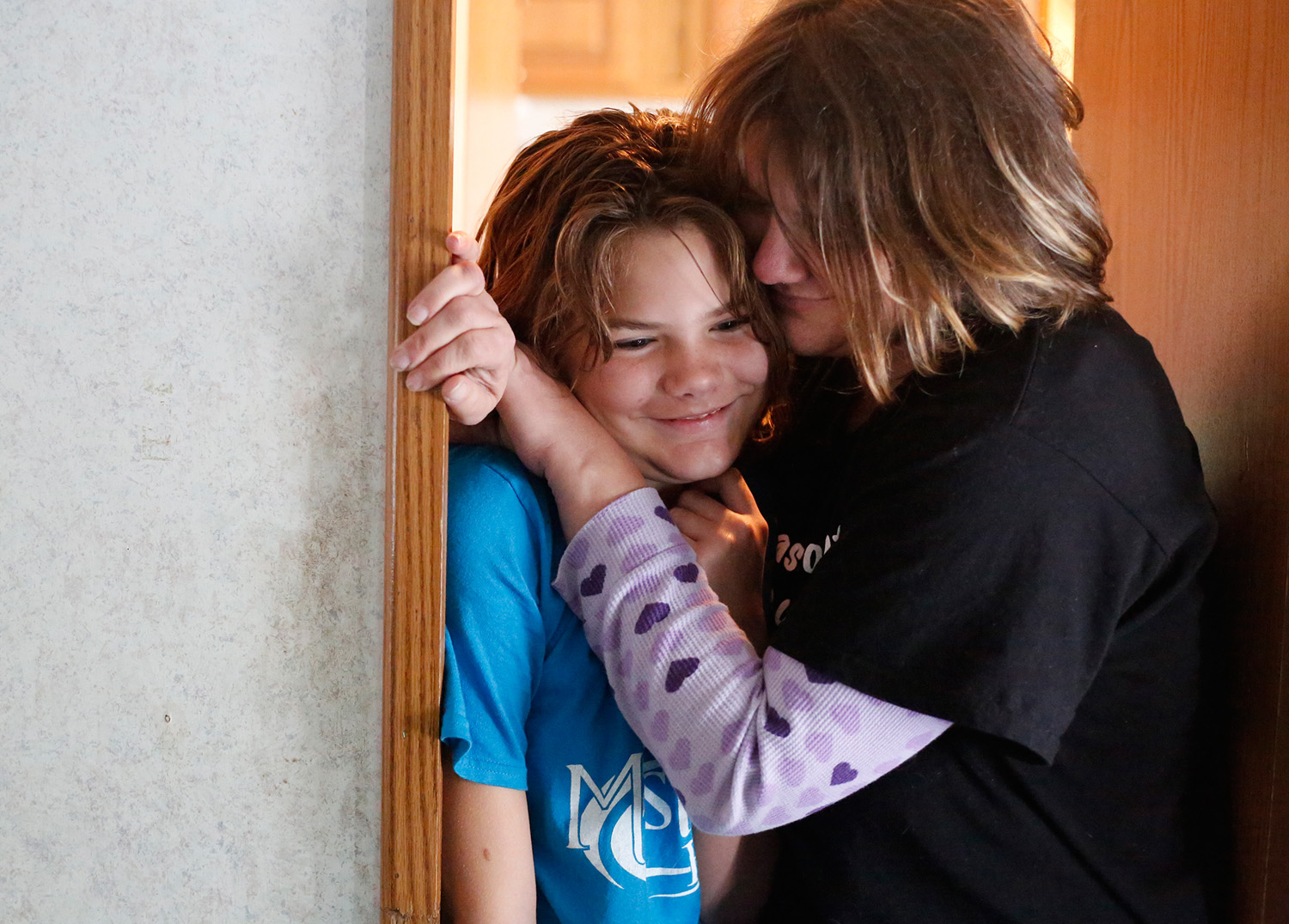 Michelle Deal and her son Tristin Deal, 11, embrace in their Flagstaff home after having a bag of toys delivered by Officer Ryan Forsman from the Northern Arizona Law Enforcement Toy Drive.