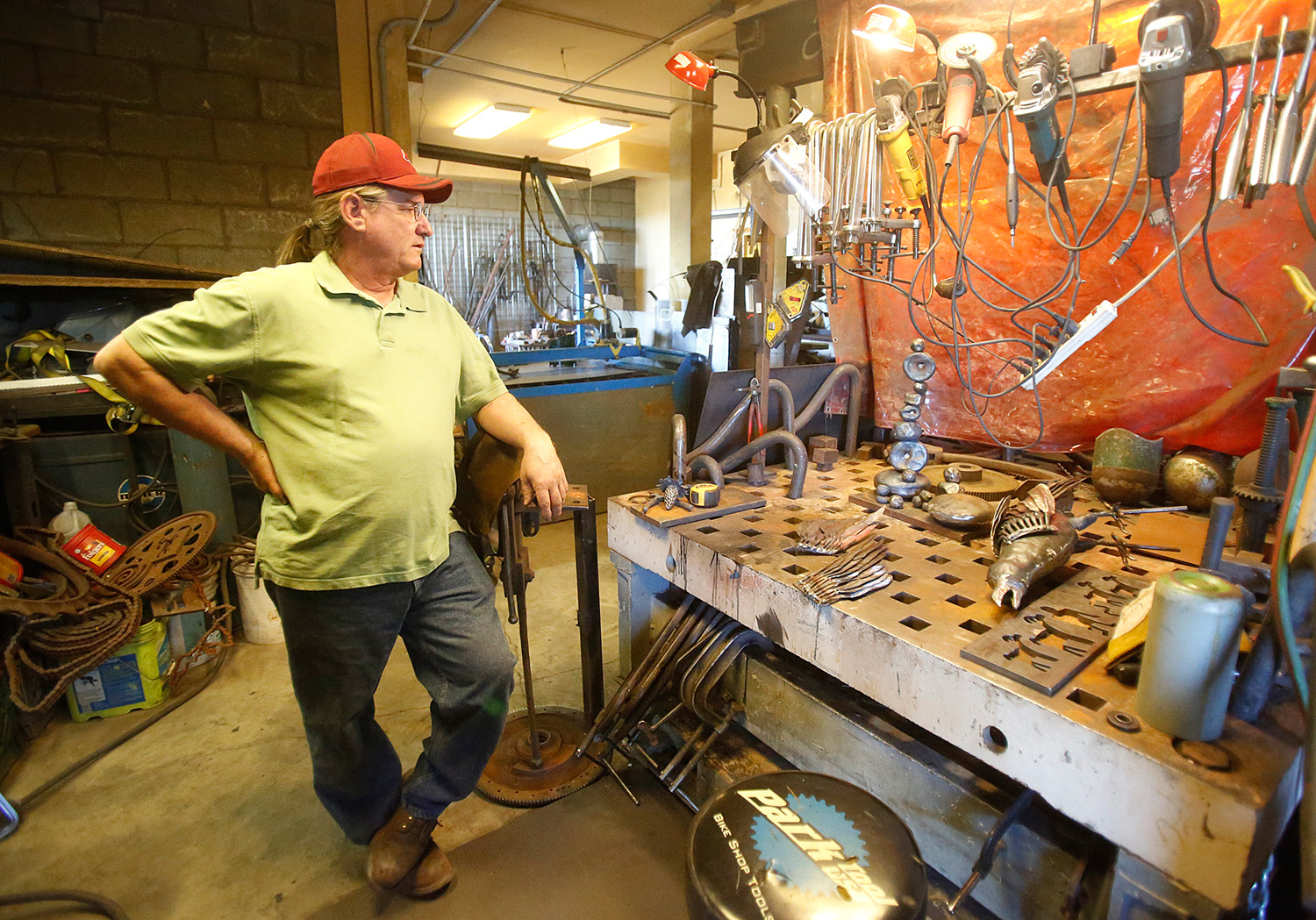 Metal sculpture artist Tom Williams stands in the workshop of his Williams, Ariz. home.