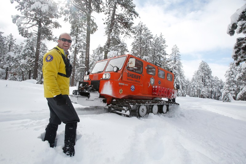 Ken Herron, a long-time volunteer with Coconino County Search and Rescue, stands in front of a snowcat being used to make a trail in the forest below Arizona Snowbowl to help direct backcountry skiers toward the main road.