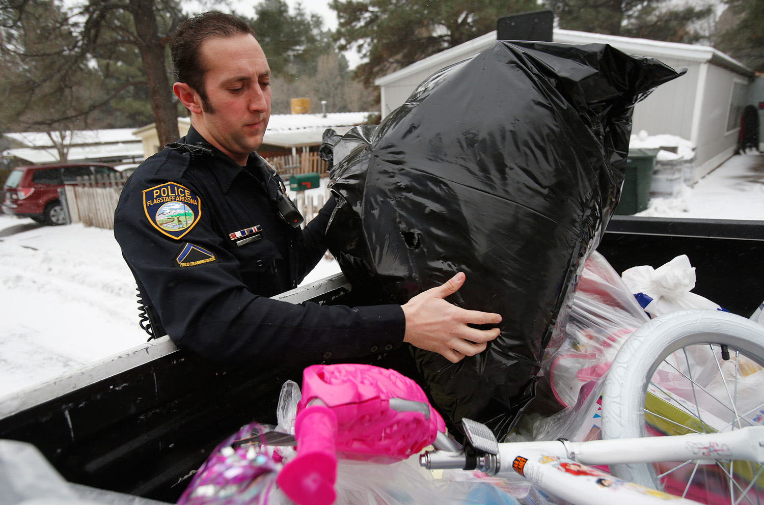 Flagstaff Police Officer Ryan Forsman lifts a bag of toys from the bed of his pickup truck before delivering them to a family as part of the annual Northern Arizona Law Enforcement Toy Drive.